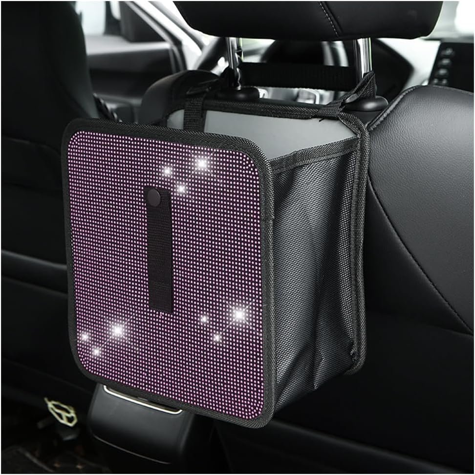 Car Foldable Trash Can, Bling Rhinestone Crystal Auto Hanging Waterproof Leakproof Garbage Bin, Vehicle Waste Basket Dustbin, Multipurpose Car Organizer Accessories for Truck RV (Pink)