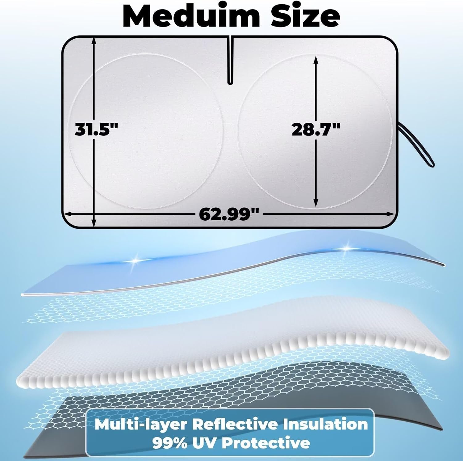 Windshield Sun Shade for Car Foldable Front Window Sun Visor 240T Reflective Fabric Blocks UV Rays and Sun, Interior Protection for Cars,Trucks, s|M (63”x31.5”)